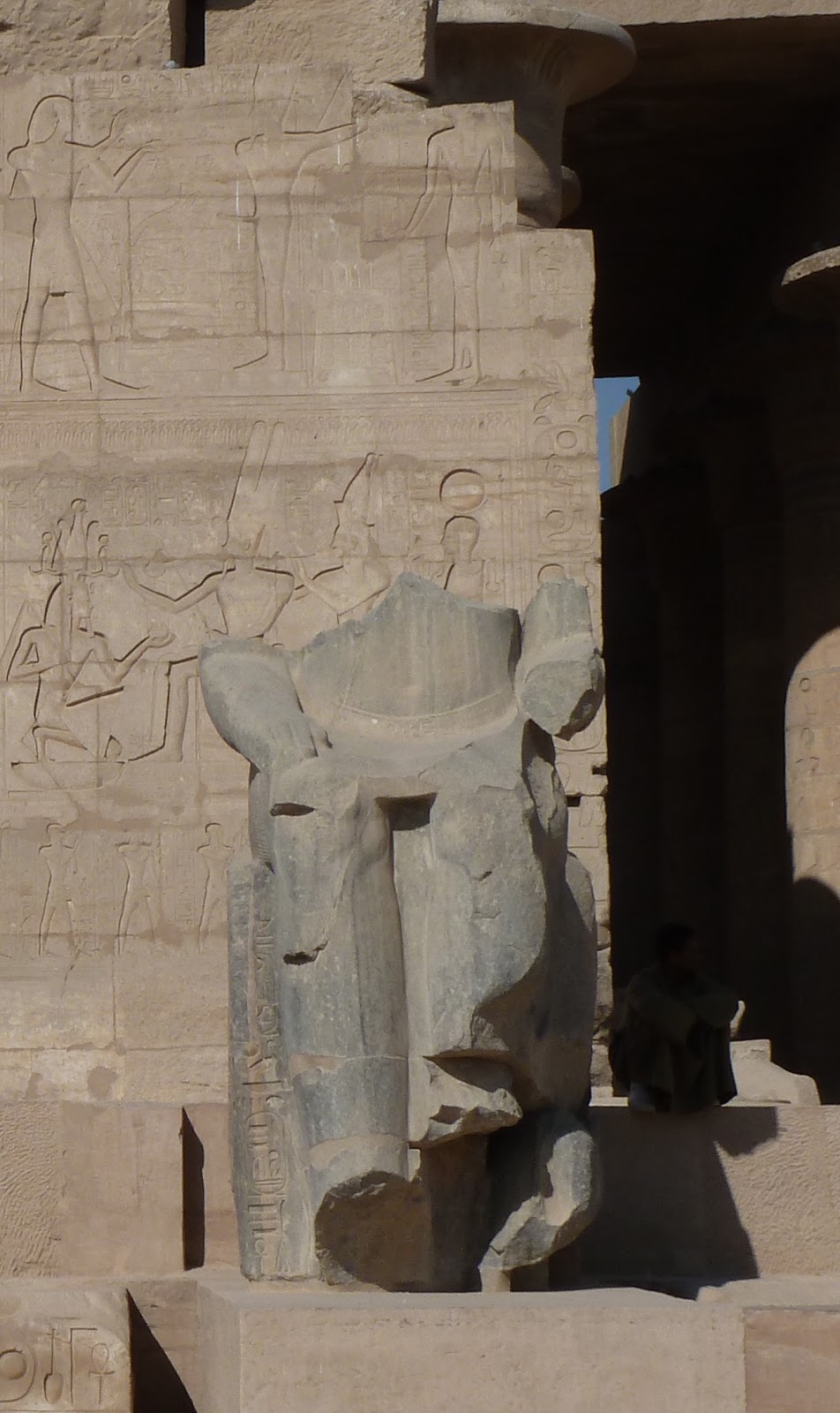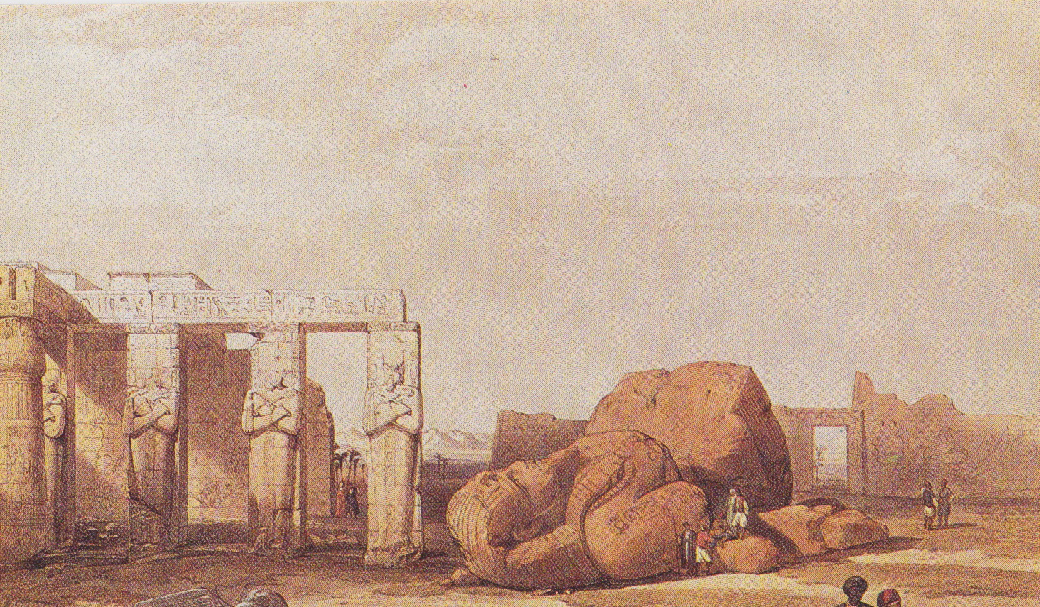 Below a general view of the Ramesseum by Norden in 1737 with the fallen visage of Ramsess II on the right. The figure on the ground in the middle between the four Osirid statues could the the bust removed by Belzoni mentioned below.