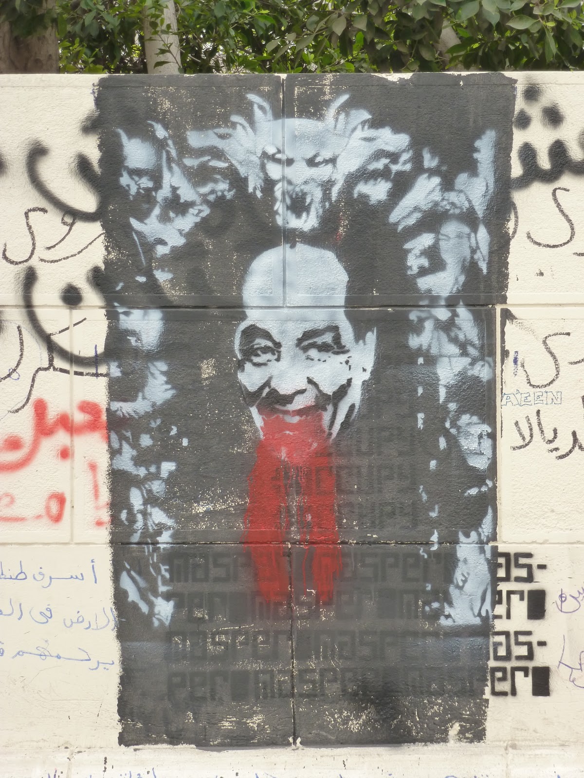 Wondering around the streets of Cairo during these revolutionary times I have found and photographed nearly 100 works of [street] art. It seems the graffiti art trend has spread! New artists copying the style of our Banksy, but in a revolutionary context. I asked my daughter-in-law, who is a strong supporter of the revolution, to translate some of the arabic on them, but didn’t have the time to get her to translate them all for me. Like i said, over 100 photos! Here are some of my favourites.